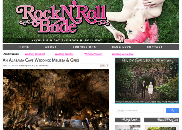 Melissa and Greg’s cave wedding was featured on Rock ‘N Roll Bride.